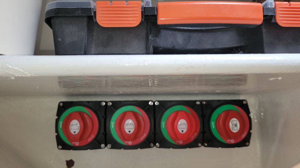 • A DC–DC charger between the engine start battery and the LiFePo4 battery, powered by the engine alternator.