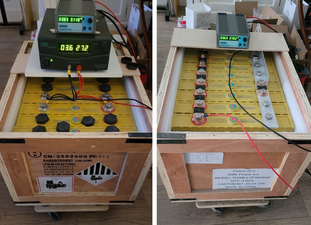 The first step was the initial charging of the cells. The eight cells have consecutive serial numbers and originate from the same production batch. All arrived from the factory at approximately 3.28 V. Using a laboratory power supply, I charged each cell individually to 3.65 V. This process took about a week, with charging paused overnight. The cells were then connected in parallel, forming a single 3.2 V, 2400 Ah battery, and charged again to 3.65 V—a process that took only about ten minutes. After a short rest period, the cells were finally connected in series to form the 24 V, 300 Ah battery.