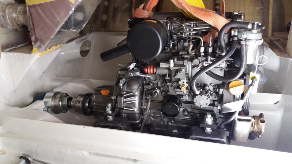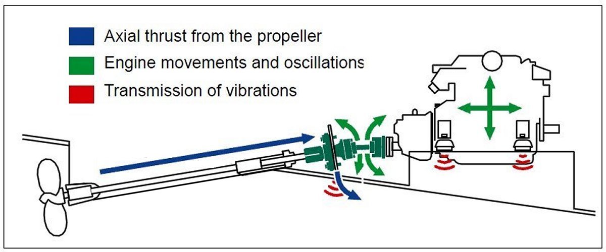 The Aquadrive constant velocity shaft decouples engine alignment from the propeller shaft, allowing soft engine mounts, reduced vibration and direct transfer of thrust loads to the hull.