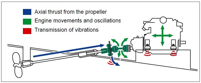 The rolling action of the balls within the CV joints absorbs all axial and radial loads, allowing the use of very soft and efficient engine mounts while reducing wear in connected bearings. Large, dedicated thrust bearings transfer the propeller thrust directly to the hull rather than to the engine. In addition, the propeller shaft is much better supported, resulting in smoother operation and reduced wear of the stern seal.