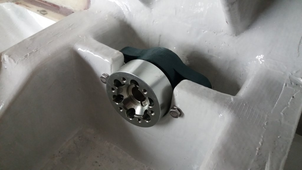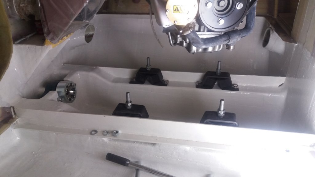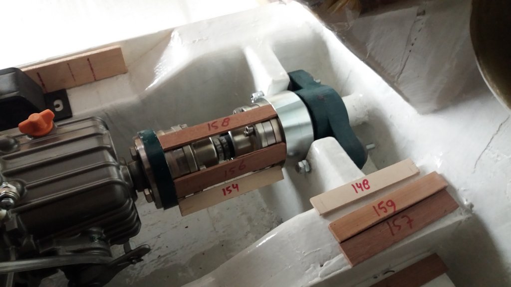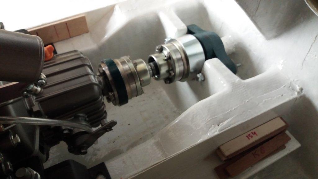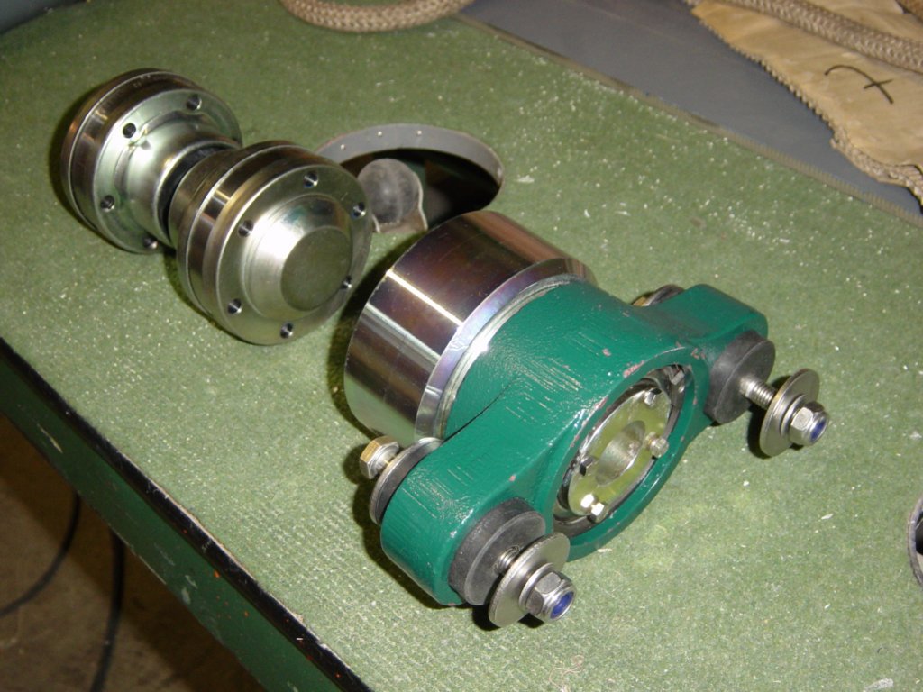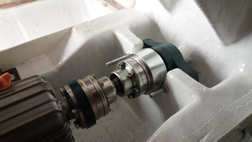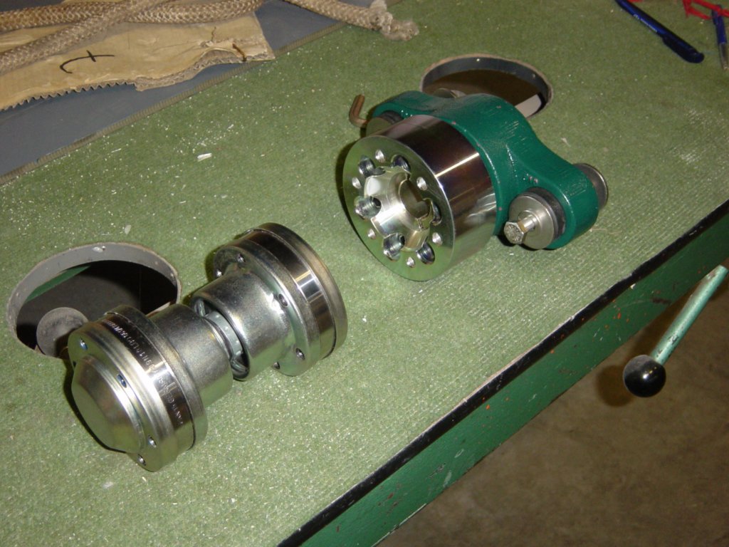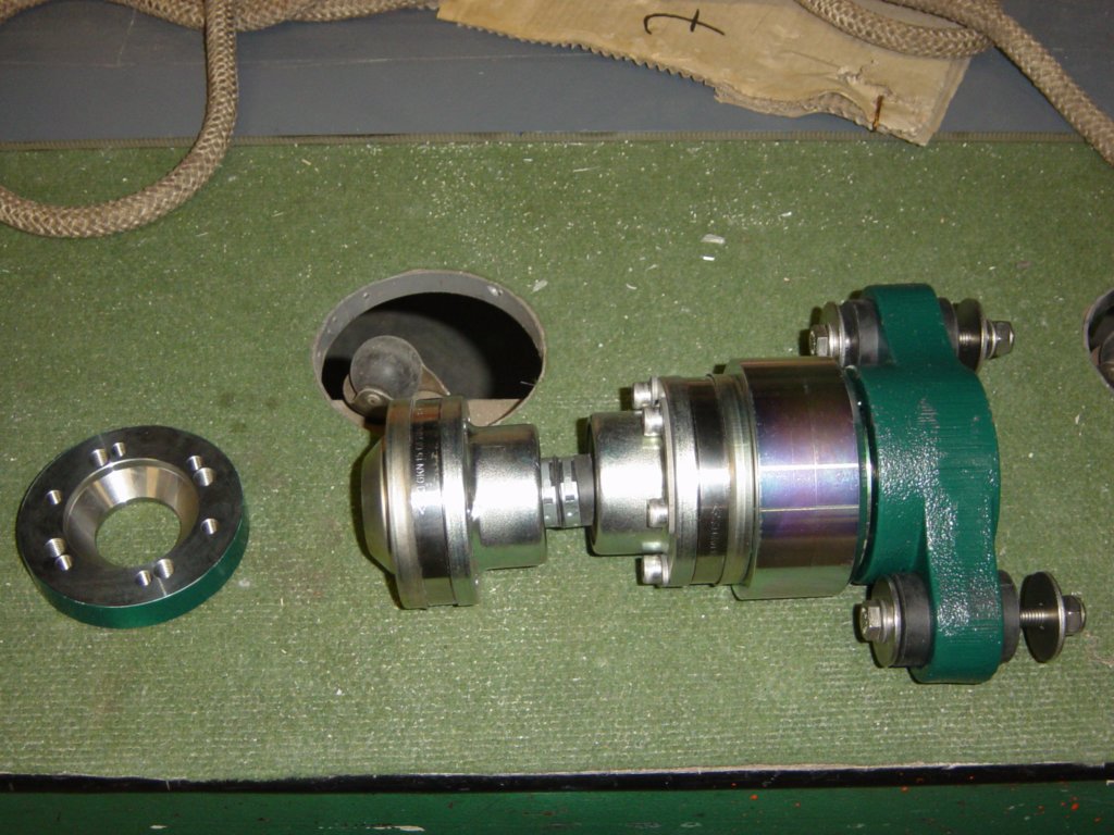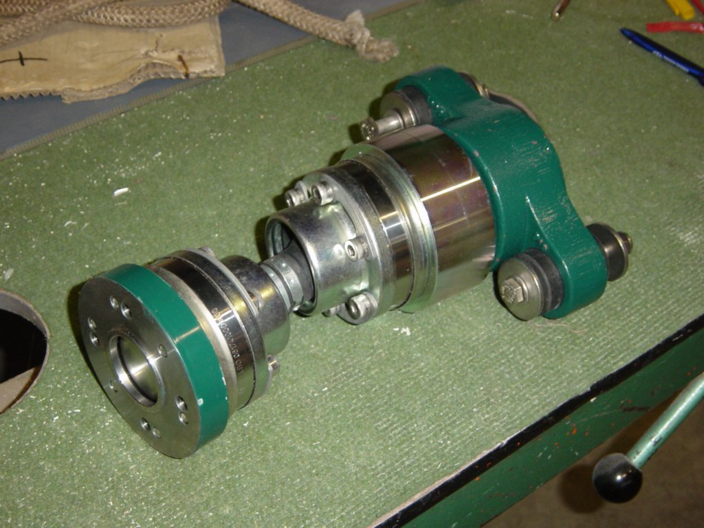 This photo gallery (21 images) shows the Aquadrive system in detail, including the thrust bearing, constant velocity joints, engine flange adapters and final alignment within the hull.