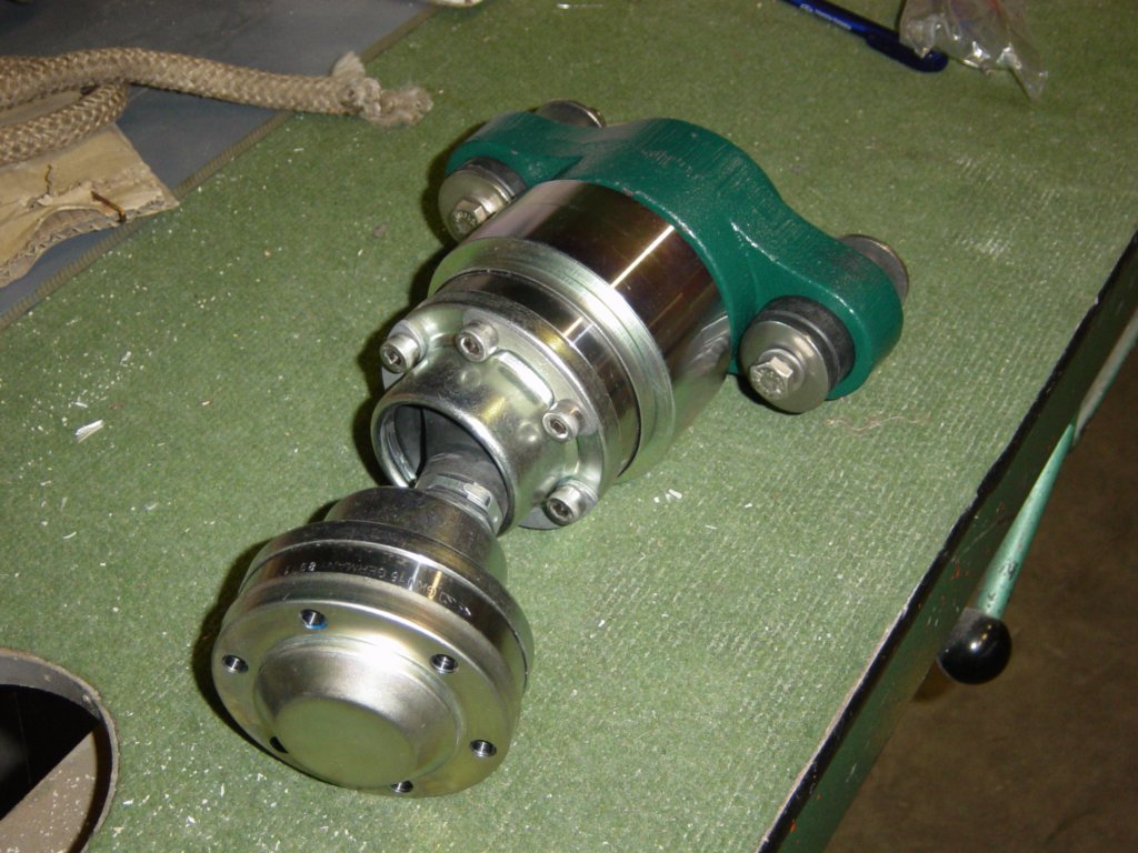 For ease of engine installation and to reduce vibration and noise, I chose an Aquadrive Constant Velocity (CV) drive shaft. The variable-length shaft incorporates two true plunging constant velocity joints, each capable of operating independently at any angle. This eliminates the need for precise engine alignment, both during initial installation and throughout the service life of the installation.
