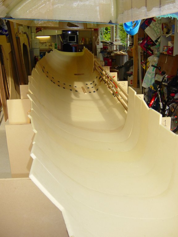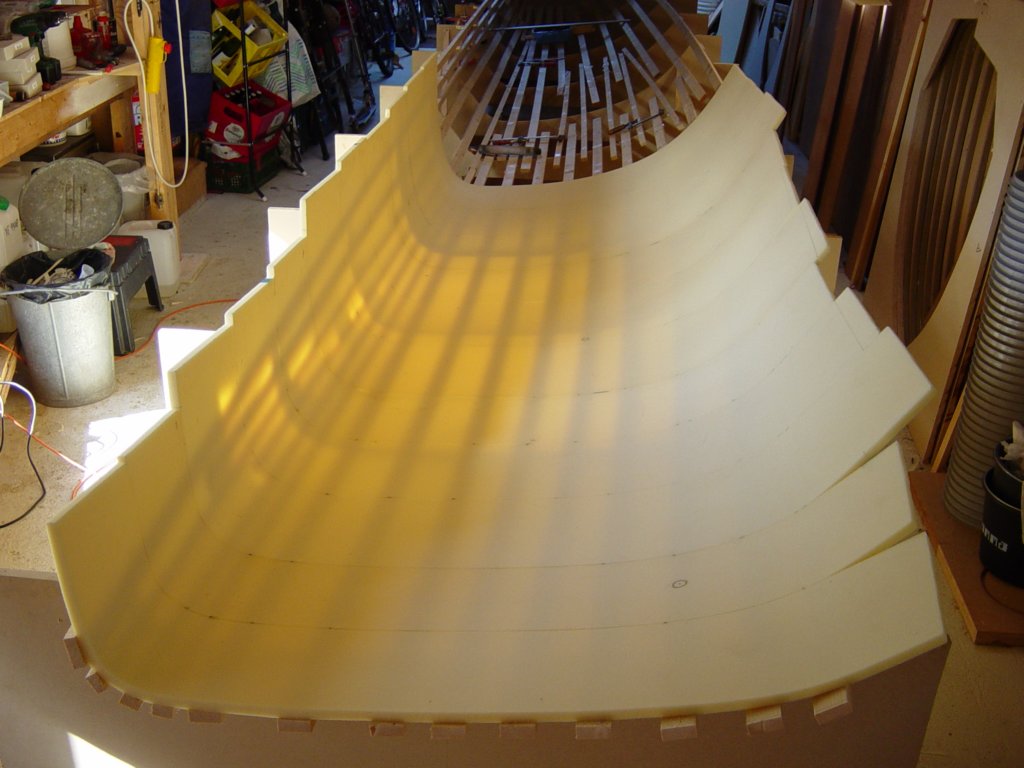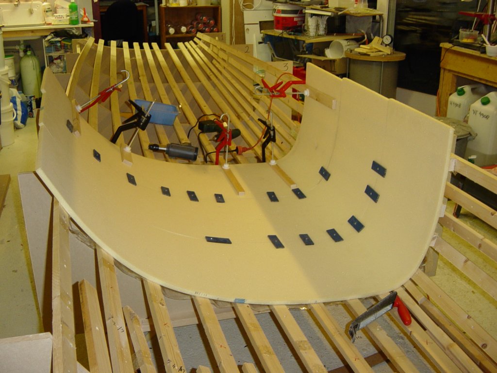 For the vacuum infusion I need an airtight foam hull, so screwing down from inside through the foam is not possible. The 30 mm screws pass from the outside through the wooden slat in the back of the foam and remain 3 mm free from the inner foam surface. The strips are mounted “dry” and the joints between the strips are milled with a Dremel tool and filled with microballoons afterwards. This gives me the best assurance that the joints are sufficient impenetrable. The foam strips are 400 mm. wide in the middle of the hull to 300mm wide to both ends. With these economical sizes I can get 3 or 4 strips out of one plain sheet 4'x8' (1220x2440 mm.)