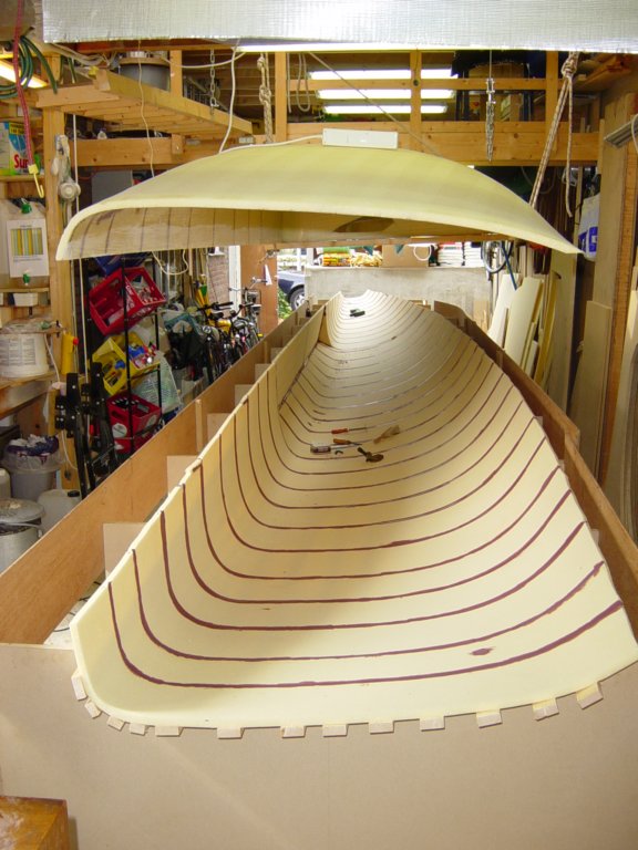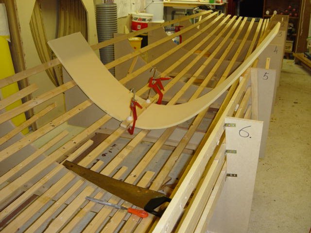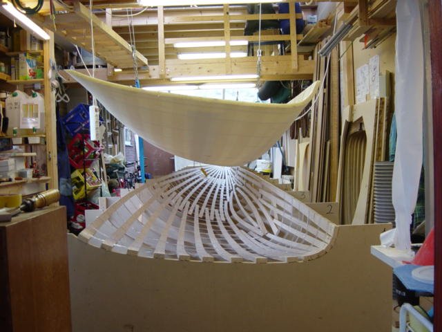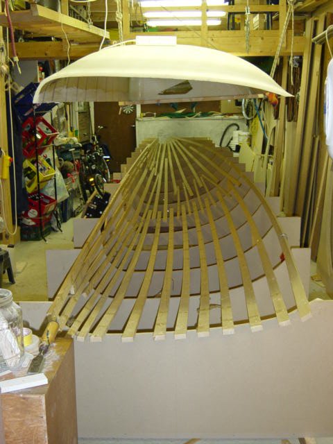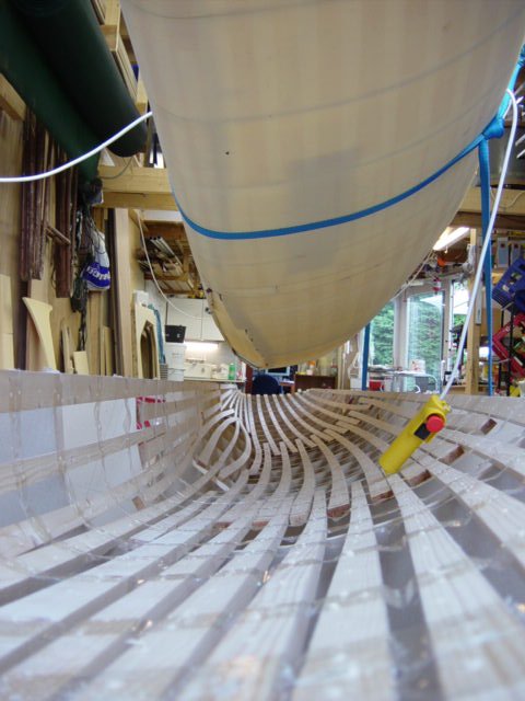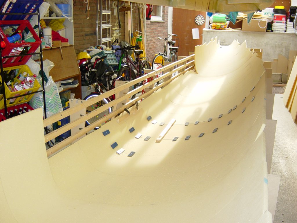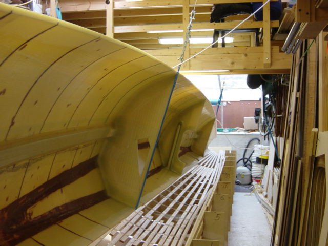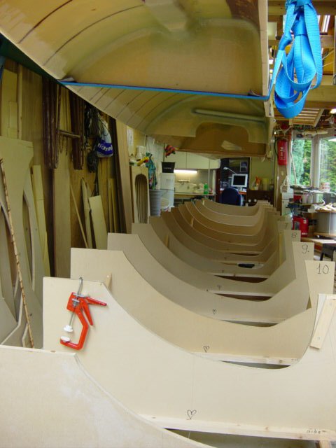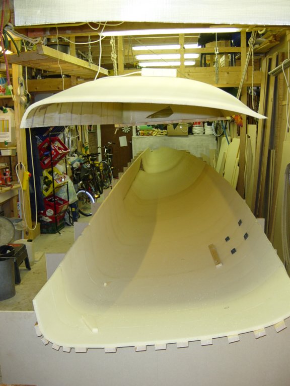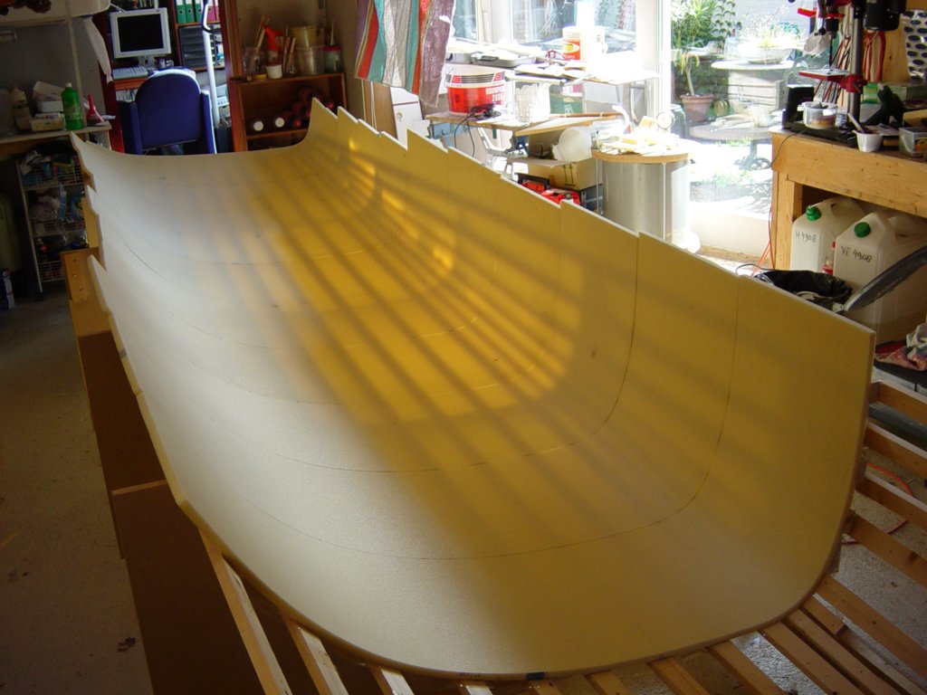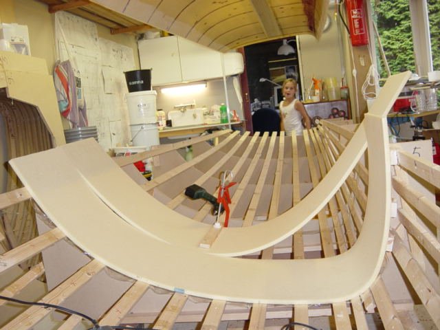 The hull halves are not symmetric, due to the raised deck area. The form of this half is not “self-releasing”, in other words, the raised deck area “hangs over”. This required an other setup of the battens in that area, which will allow to remove these battens while the hull is still in the form frames.
