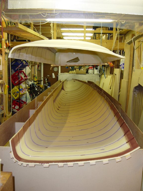The float half still in the frames takes care for the correct shape, while the hull half on top is out of shape between the bulkheads. Once correctly aligned at both ends and bulkhead stations, this is not a real problem. With some temporally screws the shape of the hull half on top is easy corrected to the shape of the hull half below. With some bog between and taped bulkheads in the middle, the now joined hull is strong enough to release from the frames and, while turned in a convenient position, to go inside for taping the keel and deck join. I am happy with my four electrical winches in the ceiling, with which I can lift and turn the hull on my own.