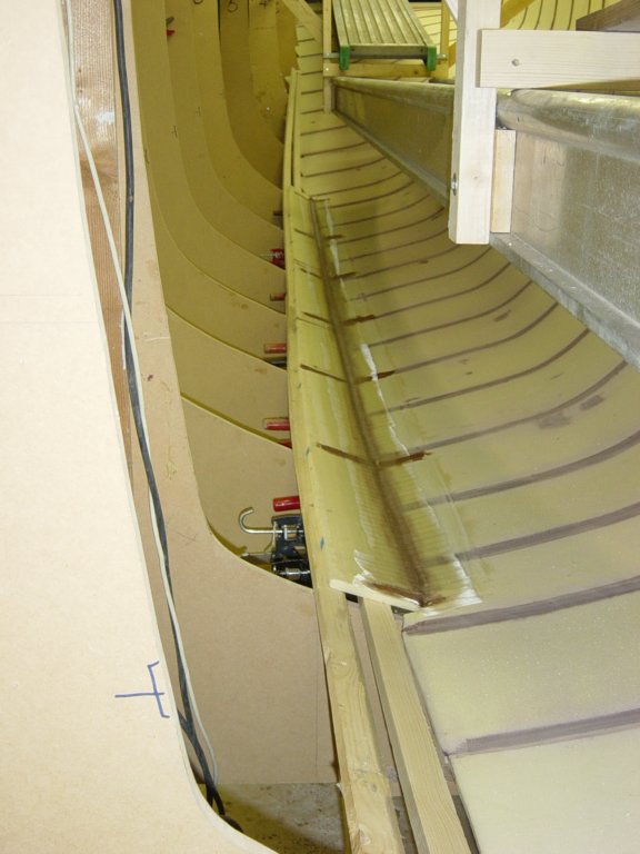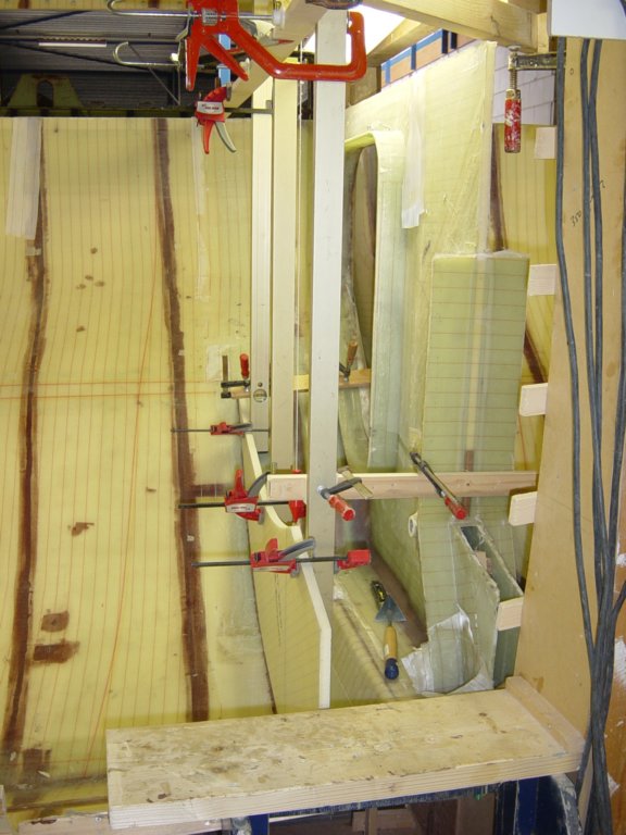 Looking for a material that is able to follow the hull shape and in the same time remains horizontal, I found Styrodur insulation foam to be the suitable material. All positions are marked with a laser and the mold is formed by the Styrodur which is supported by temporary pieces of wood. Because of the light weight of the Styrodur it is easy to fix with a 3M glue spray.