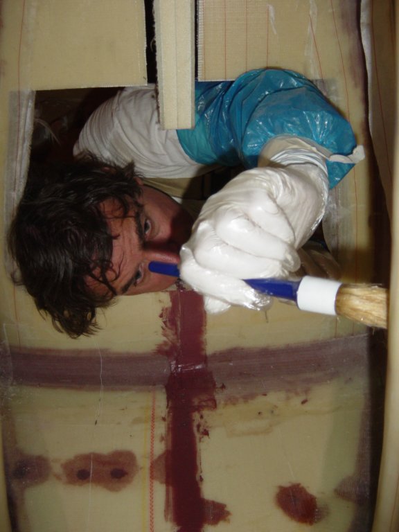 I can say I now have a lot of experience with making airtight vacuum bags. As a matter of fact, within this project this is big hull vacuum bag number 9 and I thought it would be a piece of cake. After all, it is not just a vulnerable foam hull anymore but a foam hull with an airtight internal laminate. And the joins of the Port and Starboard halves are covered with a glass tape. So no worries about air tightness. I thought ........