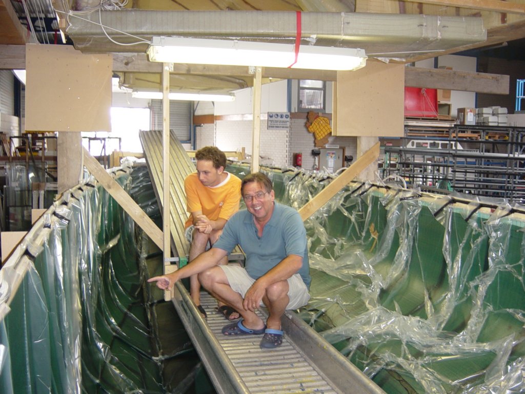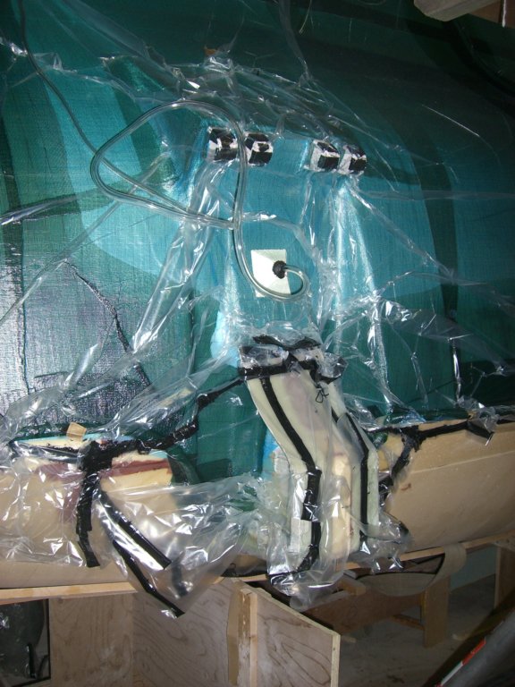 Two weeks later it had to happen! After some more changes (read four 8’ extensions to get more space around the beam flanges) in this very recalcitrant vacuumbag and further improvements of the hull vacuum integrity. Despite the fact the third version of the vacuum bag was still not perfect the infusion started at 3.00 PM in the afternoon. As usual, there was a lot of interest from colleagues and friends. There were a few precautions taken to be able to solve possible problems during the infusion and this has worked out satisfactorily. Only the end counts and despite the troublesome preparations it was again a success, a big relief and another milestone in the project. After an evening and night watch during the cure of the resin I went home at 5.00 AM the next morning, tired but with a good and happy feeling.