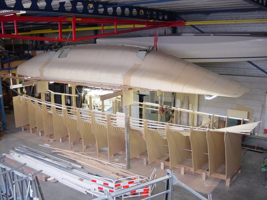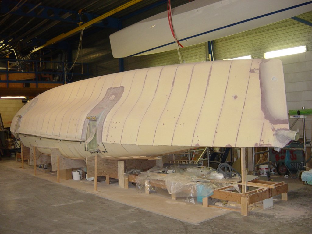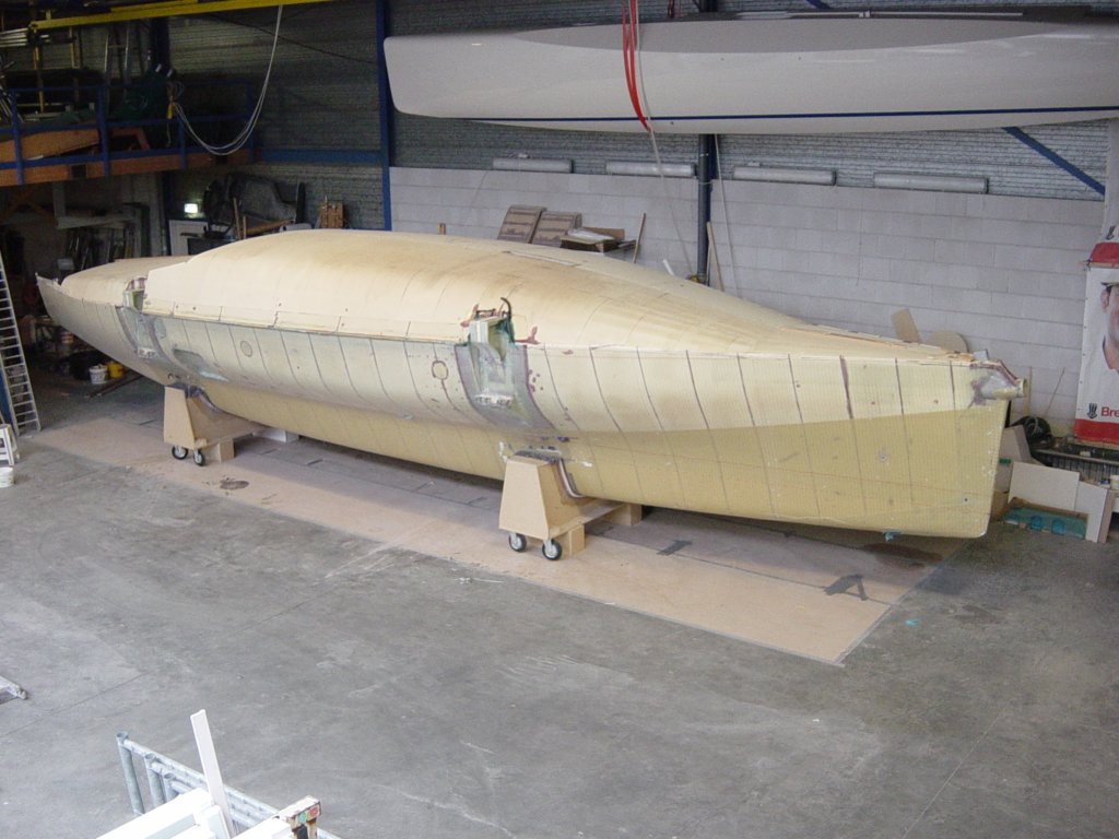 After having built five hulls, this last sixth hull has become a more or less routine job. In the spacious workshop I now only need a few days to build the basic foam hull. The construction method with the vertical foam strips works easily and quickly. See also the photo gallery and video.