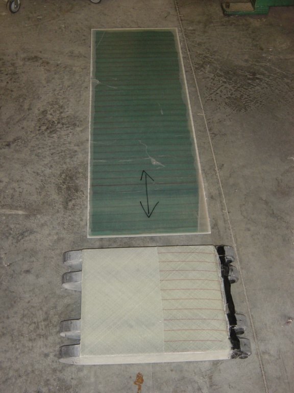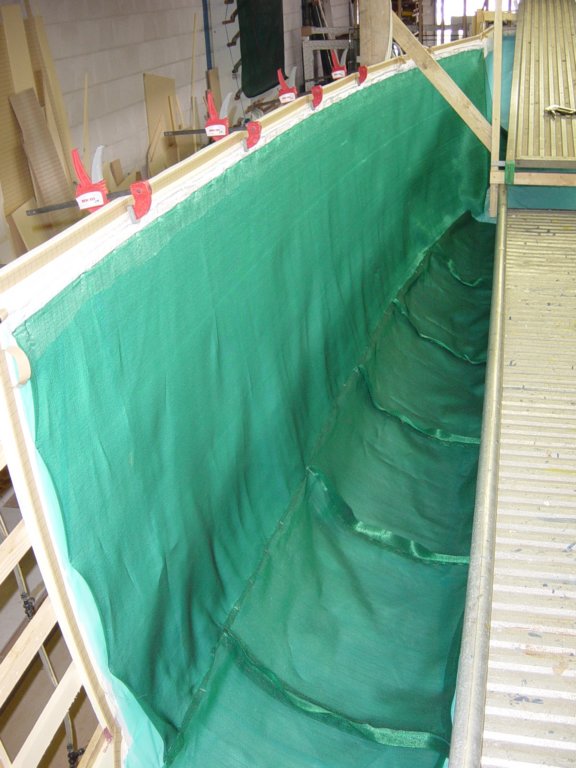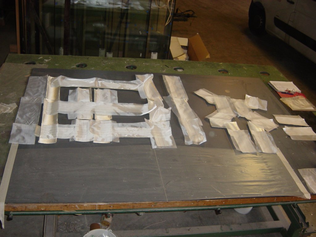 I made a little change in the lay-up schedule of the external laminate in the bottom of the hull. The plans specify an extra glass 0/90 layer in the bottom of the hull, for abrasion purposes and also for the balance between the 0° direction of the fibers inside and outside. As an alternative I've used a 45/45 Aramide (Kevlar) layer as the abrasion qualities of this type of material is superior compared to glass. The topside of the Aramide fabric is covered with a thin CSM layer, so the outside surface is glass and not Aramide. To compensate for 0° direction strength I've also added a line of glass UD in the opposite position of the internal UD layers. All in all a little heavier than specified, but good for peace of mind ....