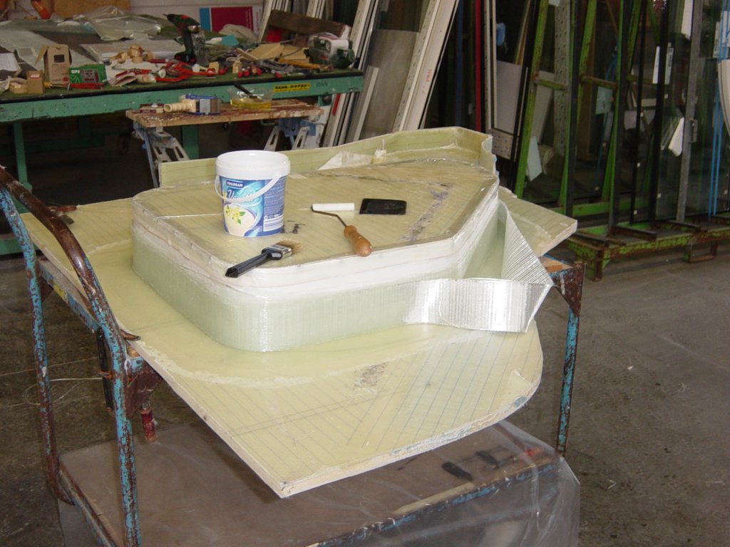 Before laying up the external laminate, various “small” other jobs has to be done . Every time it is amazing how a relatively small job takes much more time than expected. For example the beam recess on the outside of the beam bulkhead. For cutting this recess area to size and removing superfluous foam hull parts I needed all the cutting and sanding tools I have.
