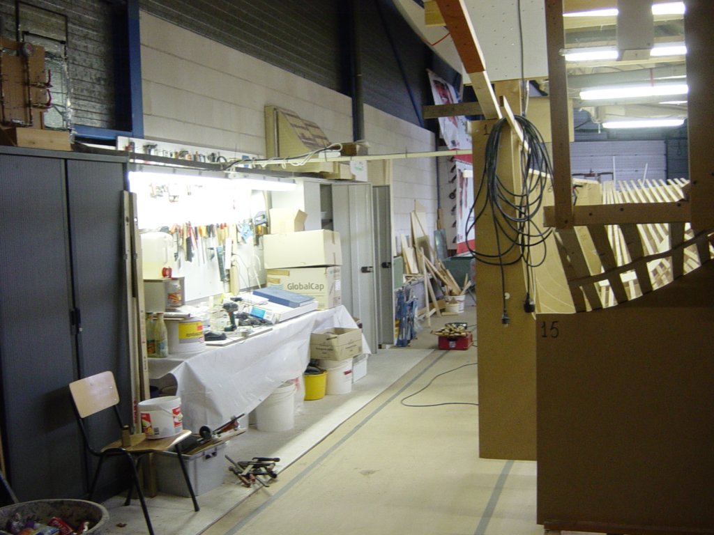 (continued from page [ 1 ]Arrived at my new construction site! Fitting out the new workshop turned out to be much more time consuming than anticipated. But now everything is in accordance with my wishes and this weekend I had the feeling to continue the boatbuilding again instead of all kind of other things, like organizing and cleaning up too much company materials, dragging along too heavy girders, hoisting and mounting too heavy winches, organizing and connecting too much electrical wires, building and pulling down again an incomplete scaffolding, which despite some missing components was strong enough to hold up the main hull half for a while, which by the way wasn't necessary if I had done the electrical winches first, etc.