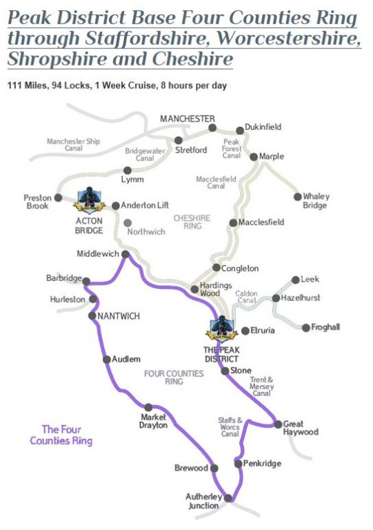 The Four Counties canal boat holiday through Staffordshire, Worcestershire, Shropshire and Cheshire is a challenging one-week narrow boat hire through several lovely canal towns and villages.