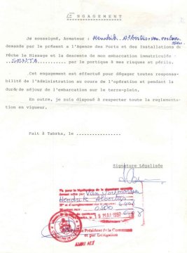 Maandag is de grote dag. Al om 7.00 uur liggen wij onder de kraan. Lazhar, de assistent havenmeester, is ondanks zijn vrije weekend al die dagen niet van onze zijde geweken. En nu gaat hij met mij mee naar het departement van de havendienst waar de kraan geregeld moet worden. Maar dat blijkt nog niet zo eenvoudig. Ik moet een in het Frans opgestelde verklaring tekenen waarin ik alle verantwoordelijkheid aanvaard en de havendienst niet aansprakelijk kan stellen voor enige schade die mogelijk kan ontstaan en dat ik mij verder onderwerp aan alle eisen en reglementen die op deze gebeurtenis van toepassing zijn. Geen probleem zou je zeggen, maar om e.e.a. te legaliseren moeten er ook nog formulieren met stempels en handtekeningen geregeld worden van Le Capitaine du Port, Le Commisaire du Police (die kende ik al) en Le Maire of Adjoint du Maire (burgemeester of verantwoordelijke wethouder)